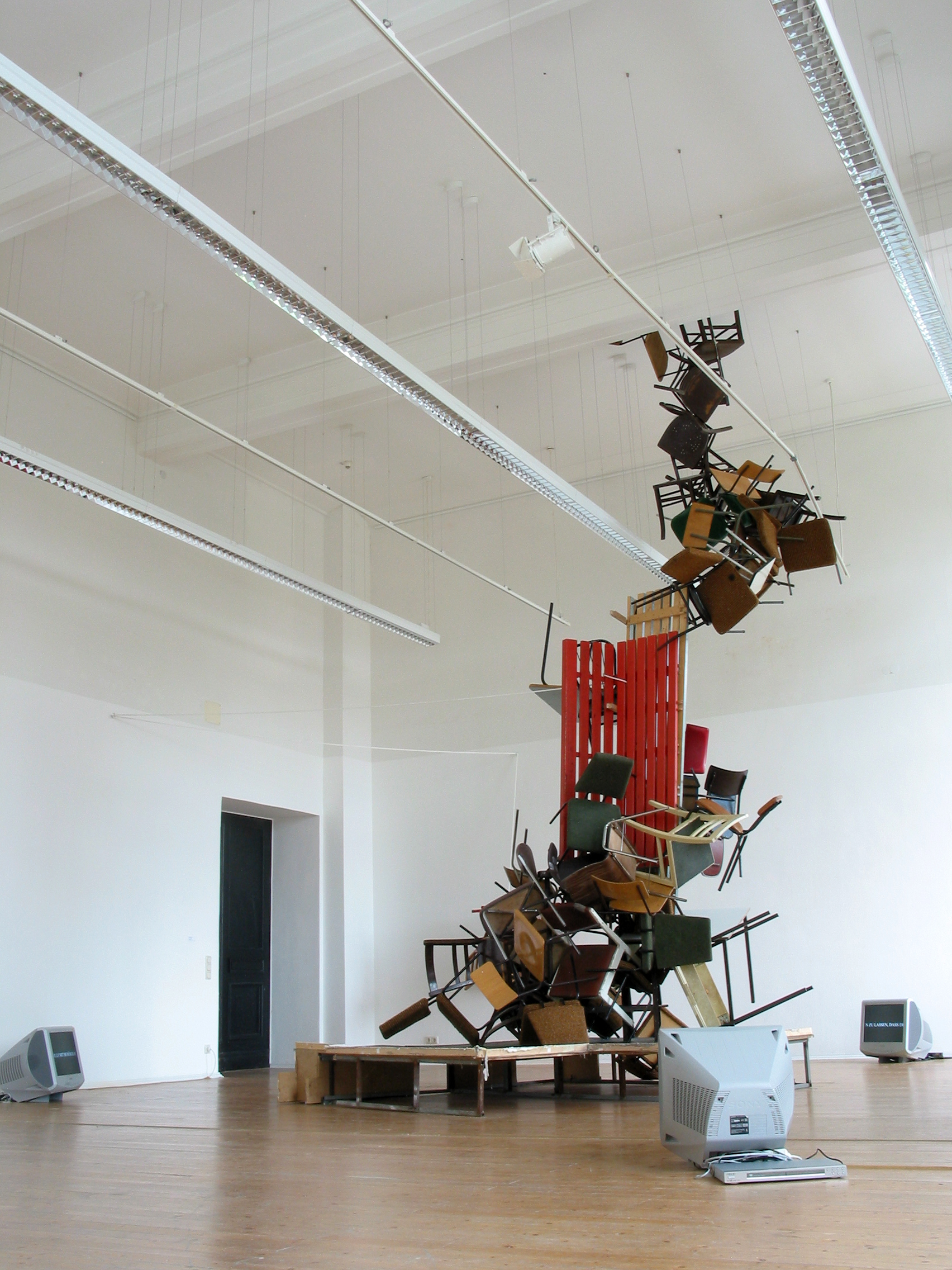 Tische, Stühle, Podest, 1 Seil, 3 Monitore